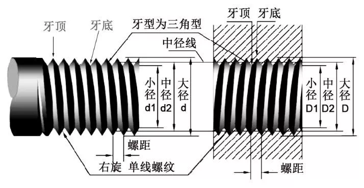 螺紋的基本要素主要有:牙型、公稱直徑、線數(shù)、螺距(導程)、旋向。