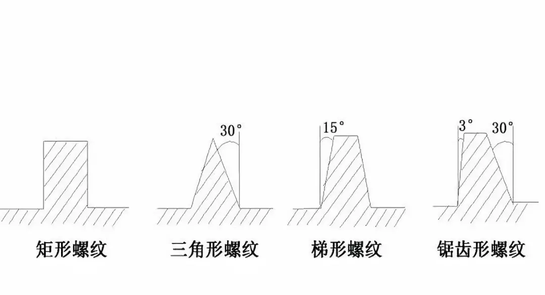 ◆ 按螺紋截面形狀分為三角形螺紋、矩形螺紋、梯形螺紋、鋸齒形螺紋及其他特殊形狀螺紋。