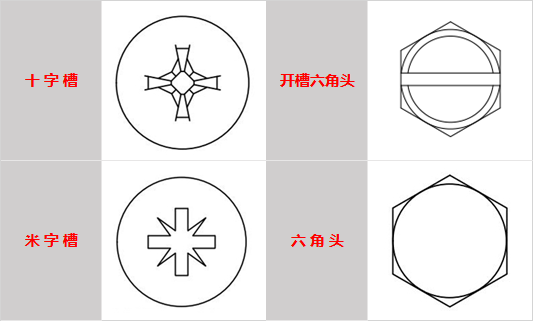 扳擰結構是為了實現(xiàn)螺紋連的裝配,保證螺釘順利安裝的受力結構,可分為外扳擰結構和內扳擰結構。下圖是自鉆自攻螺釘常見的扳擰形式,其中十字槽、米字槽均屬于內扳擰結構,六角頭屬于外扳擰結構,而開槽六角頭則兼顧了外扳擰和內扳擰結構。