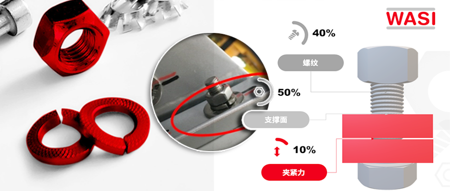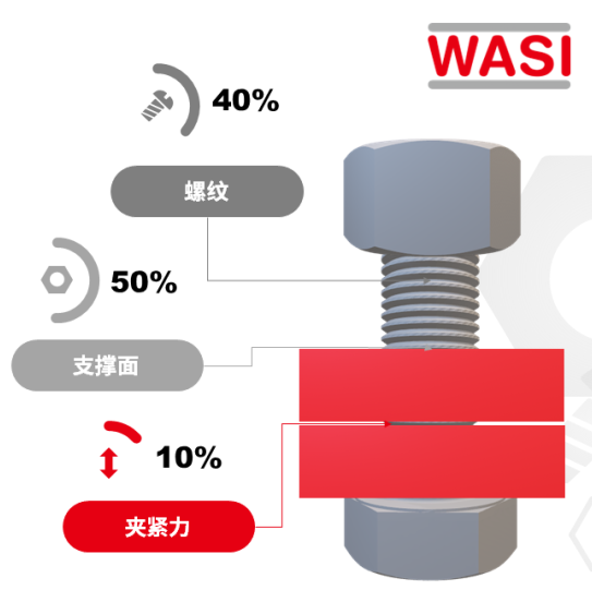 下圖為螺栓連接副中一個(gè)典型的“541”分配規(guī)則示意圖,即在螺栓連接中所施加的安裝扭矩有50%消耗于克服螺栓支撐面與基體的摩擦,40%消耗于克服螺栓、螺母配合之間的螺紋摩擦,僅有10%的安裝扭矩作用于連接副形成夾緊力。